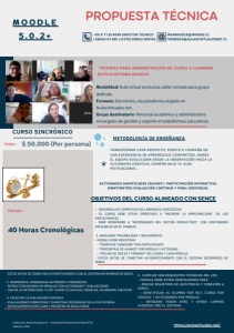 1. DESARROLLAR COMPETENCIAS LABORALES ESPECÍFICAS - EL CURSO DEBE ESTAR ORIENTADO A *MEJORAR LA EMPLEABILIDAD* DE LOS PARTICIPANTES. - DEBE RESPONDER A *NECESIDADES DEL SECTOR PRODUCTIVO*, CON CONTENIDOS APLICABLES EN EL TRABAJO. 2. ASEGURAR TRAZABILIDAD Y SEGUIMIENTO - MOODLE DEBE REGISTRAR: - *TIEMPO DE CONEXIÓN* POR PARTICIPANTE. - *PORCENTAJE DE AVANCE* POR MÓDULO Y ACTIVIDAD. - *FECHAS DE INICIO Y TÉRMINO* DEL CURSO Y CADA MÓDULO. - ESTOS DATOS SE CONECTAN AUTOMÁTICAMENTE CON EL SISTEMA INTERMEDIO DE SENCE. Institución: AulasVirtuales.net – Avenida Presidente Kennedy 5770, Vitacura, Chile Modalidad: Aula virtual exclusiva, taller cerrado para grupo definido. Formato: Sincrónico, vía plataforma alojada en AulasVirtuales.net. Grupo destinatario: Personal académico y administrativo encargado de gestión y soporte en plataformas educativas. 40 Horas Cronológicas Valor : MOOD L E 5 . 0 . 2 + PROPUESTA TÉCNICA TÉCNICAS PARA ADMINISTRACIÓN DE CURSO E-LEARNING EN PLATAFORMA MOODLE OBJETIVOS DEL CURSO ALINEADO CON SENCE $ 50.000 (Por persona) https://aulasvirtuales.net/ Horas: CURSO SINCRÓNICO +56 9 7125 8099 DIRECTOR TECNICO +56926191289 LICITACIONES/VENTAS TVENEGAS@AULASVIRTUALESNET.CL MSANHUEZA@IMASDO.CL METODOLOGÍA DE ENSEÑANZA TRANSFORMAR CADA PROYECTO, EVENTO O CAMPAÑA EN UNA EXPERIENCIA DE APRENDIZAJE COMPARTIDO, DONDE EL EQUIPO EVOLUCIONA DESDE LA OBSERVACIÓN HACIA LA AUTONOMÍA CREATIVA, SIEMPRE BAJO TU GUÍA MOTIVACIONAL. ACTIVIDADES GAMIFICADAS (KAHOOT)- PARTICIPACIÓN INTERACTIVA (MENTIMETER)-EVALUACIÓN CONTINUA Y FINAL INDIVIDUAL - ESTOS DATOS SE CONECTAN AUTOMÁTICAMENTE CON EL SISTEMA INTERMEDIO DE SENCE. 3. PROMOVER EL APRENDIZAJE AUTÓNOMO Y PROGRESIVO - ESTRUCTURA BASADA EN MÓDULOS CON ACTIVIDADES Y EVALUACIONES. - USO DE LA METODOLOGÍA *I+DO* (COMO TÚ APLICAS): MODELAR, COLABORAR, EJECUTAR. 4. FACILITAR LA EVALUACIÓN CONTINUA - EVALUACIONES FORMATIVAS Y SUMATIVAS INTEGRADAS EN LA PLATAFORMA. - RETROALIMENTACIÓN CLARA Y REGISTRO DE RESULTADOS. 5. CUMPLIR CON REQUISITOS TÉCNICOS DEL LMS - MOODLE DEBE ESTAR CONFIGURADO PARA: - ENVIAR REGISTROS DE ASISTENCIA Y CONEXIÓN A SENCE. - IDENTIFICAR AL ALUMNO POR RUT, CURSO POR CÓDIGO, Y ACTIVIDADES POR MÓDULO. - INTEGRAR TOKEN OTEC Y OTROS CAMPOS EXIGIDOS POR EL SISTEMA.